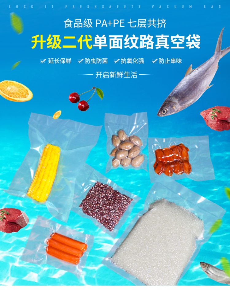 真空袋,又稱貼身防潮袋、鋁箔袋、鋁塑復合袋,其材質一般為PE\PA,主要分為食品真空袋、藥用真空袋、電子真空袋、軍工真空袋、高溫真空袋、低溫真空袋、粉劑真空袋、顆粒真空袋、固體真空袋、粒子真空袋、VIP真空袋、STP真空袋、25KG真空袋、防毒真空袋、計生用品真空袋、壓縮食品真空袋、密封真空袋等其他真空袋。